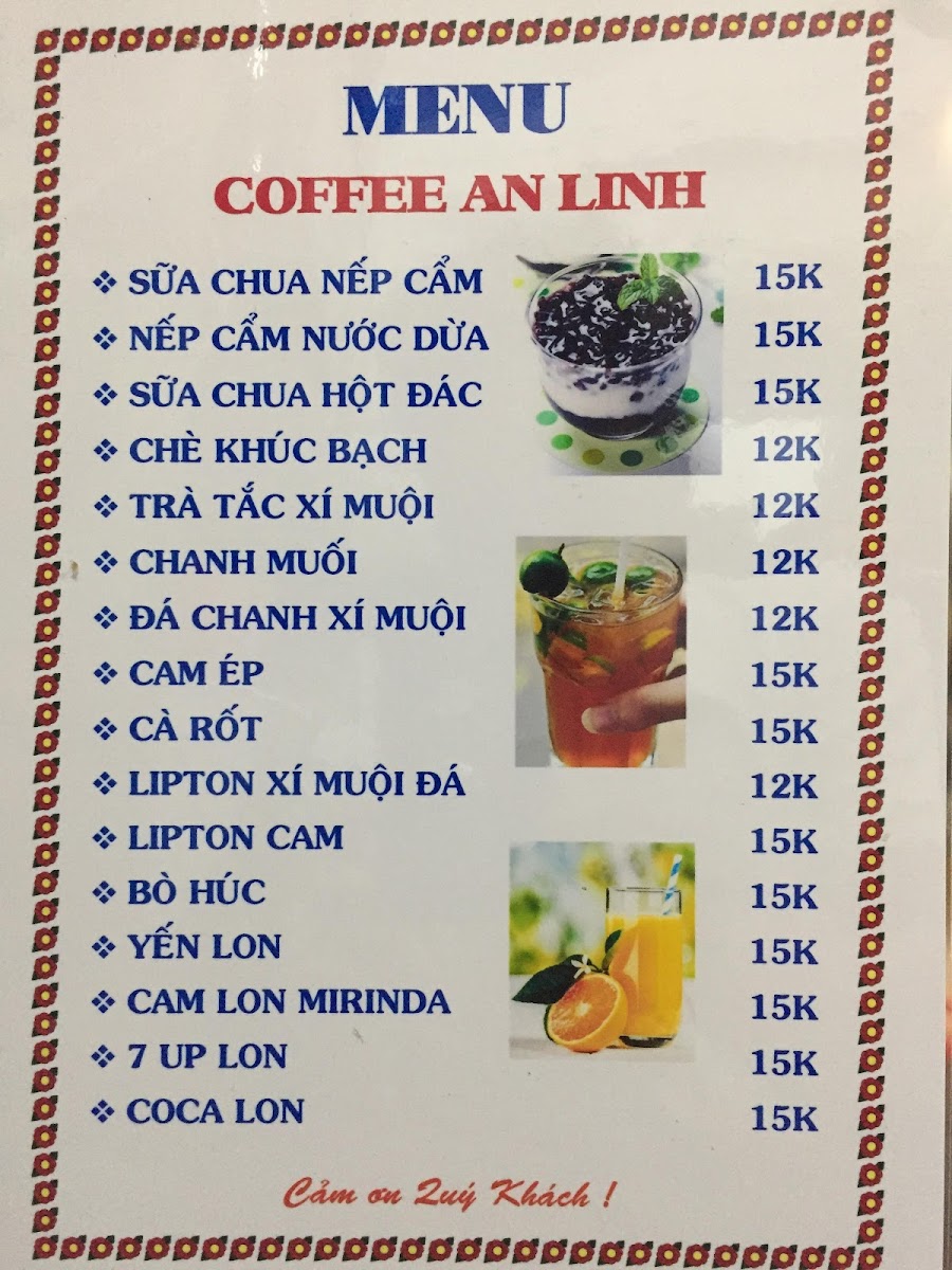 At Coffee An Linh, you can indulge in a variety of delightful drinks crafted from 100% pure coffee beans. Their Cà phê đen Nguyên chất, priced at just ₫10,000, offers a robust and pure essence that will awaken your senses with every sip. If you prefer something a tad sweeter, the Cà phê sữa Nguyên chất, available for ₫12,000, brings together the velvety richness of milk and coffee for a harmonious blend that’s the perfect pick-me-up.